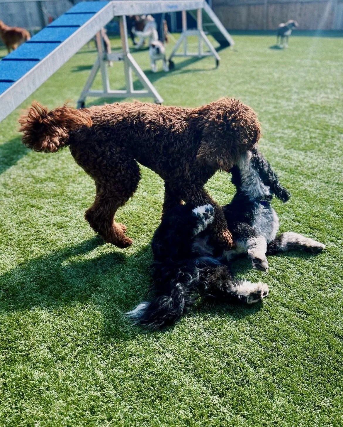 Playschool includes group socialization, agility training for mental stimulation and confidence building and basic obedience. Drop your dog off and we’ll structure their play time to improve their behavior.